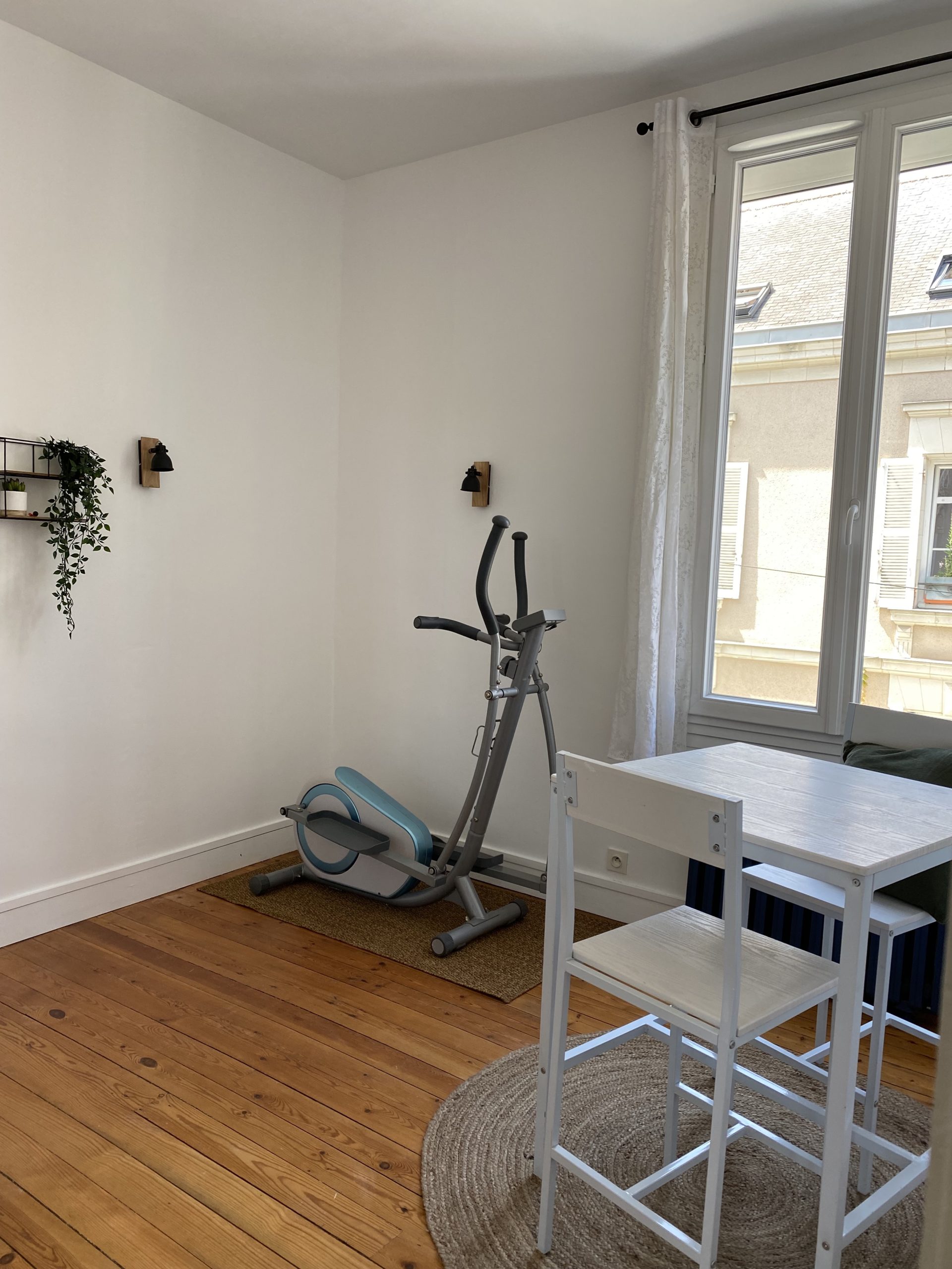 Cette pièce contient une table haute avec 2 chaises, pour travailler à 2, ainsi qu’une table et un fer à repasser, un tancarville, un vélo elliptique et plusieurs haltères.